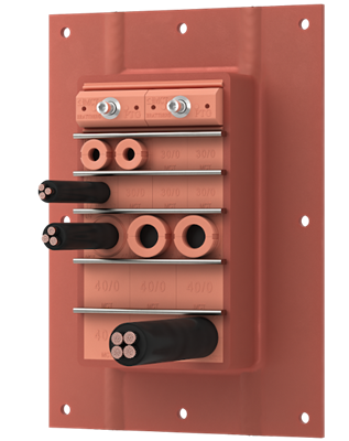 The system consists of a frame, rubber blocks and a compression unit. The frame is casted or bolted to a structure and packed with rubber blocks suited for each cable and pipe dimension. The compression unit is inserted to compress the rubber blocks against cables and pipes to establish a tight seal.