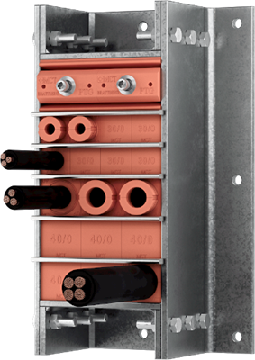 The system consists of a frame, rubber blocks and a compression unit. The frame is casted or bolted to a structure and packed with rubber blocks suited for each cable and pipe dimension. The compression unit is inserted to compress the rubber blocks against cables and pipes to establish a tight seal.