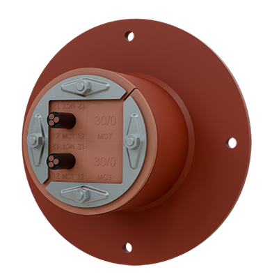 The round transit system consists of a round rubber frame and rubber blocks. The RGP circular multi cable & pipe transit is assembled in sleeves, pipes, drilled or cast holes and packed with rubber blocks suited for each cable and pipe dimension. The compression bolts are tightened to compress the rubber blocks against cables and pipes to establish a tight seal.
